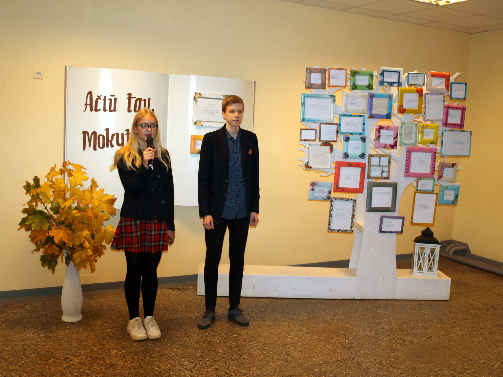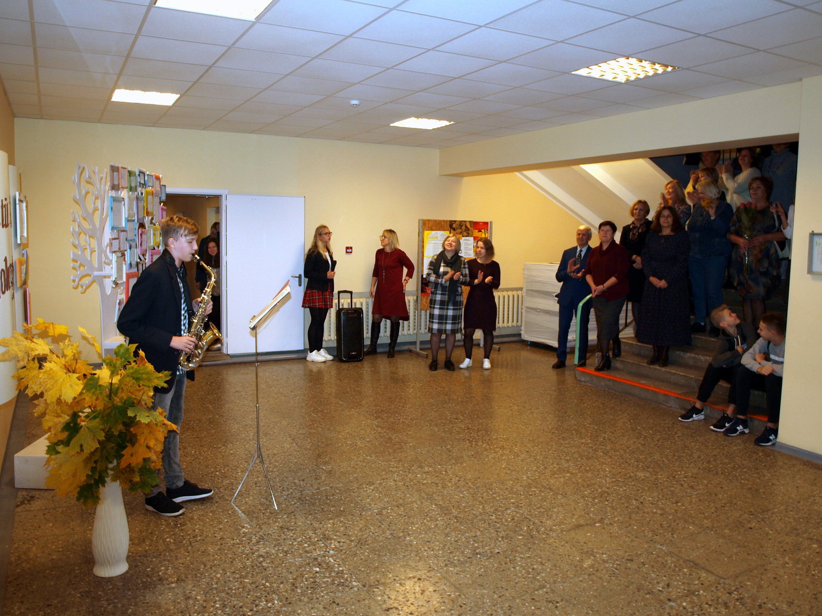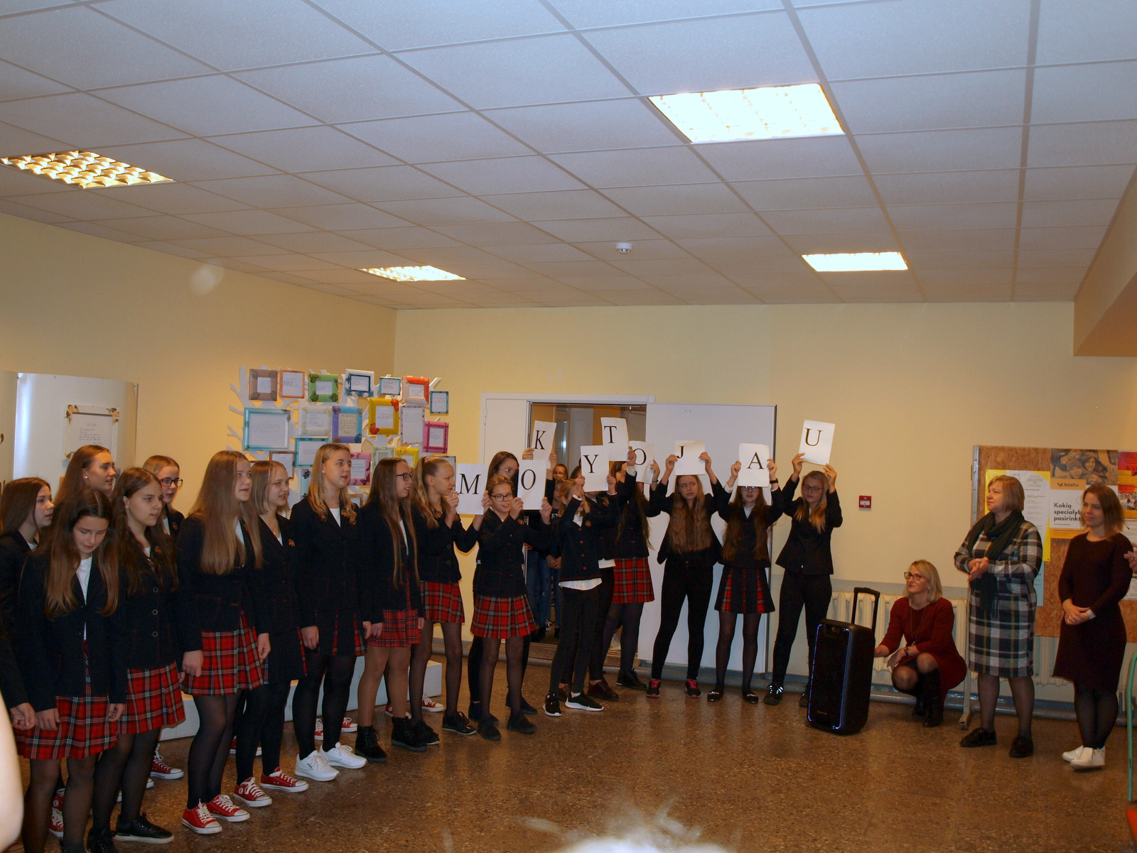 Ryte, nuskambėjus skambučiui, I aukšto fojė mokytojų laukė muzikinis mokinių sveikinimas, o per pertrauką dešimtokai mokytojus apdovanojo linkėjimais – lankstinukais ir saldainiais.