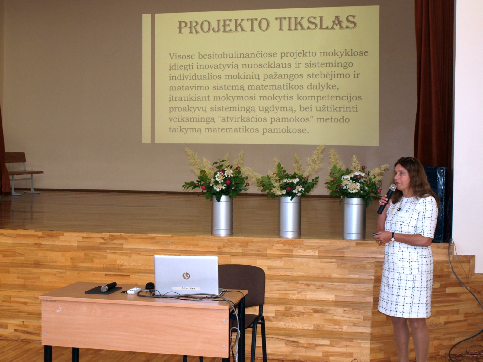 Direktoriaus pavaduotoja ugdymui Vaidutė Slavinskienė priminė, kad vykdydami projekto veiklas pradinių klasių mokytojai siekė bendro tikslo – įdiegti inovatyvią nuoseklaus ir sistemingo individualios mokinių pažangos stebėjimo bei matavimo sistemą, veiksmingai taikyti ,,Atvirkščios pamokos“ metodą ir ugdyti mokėjimo mokytis kompetenciją matematikos pamokose, pristatė projekto metu sukurtus įrankius.