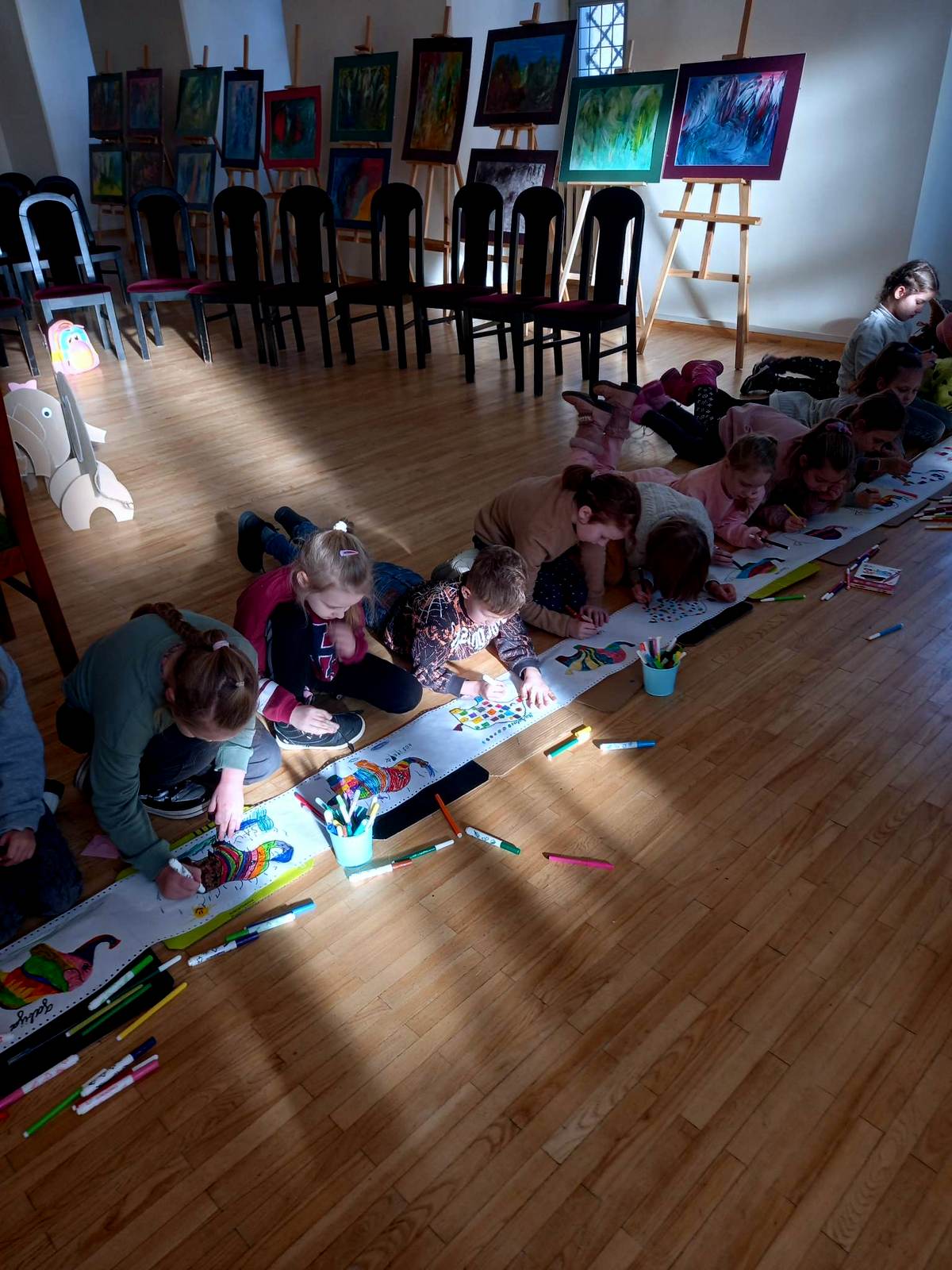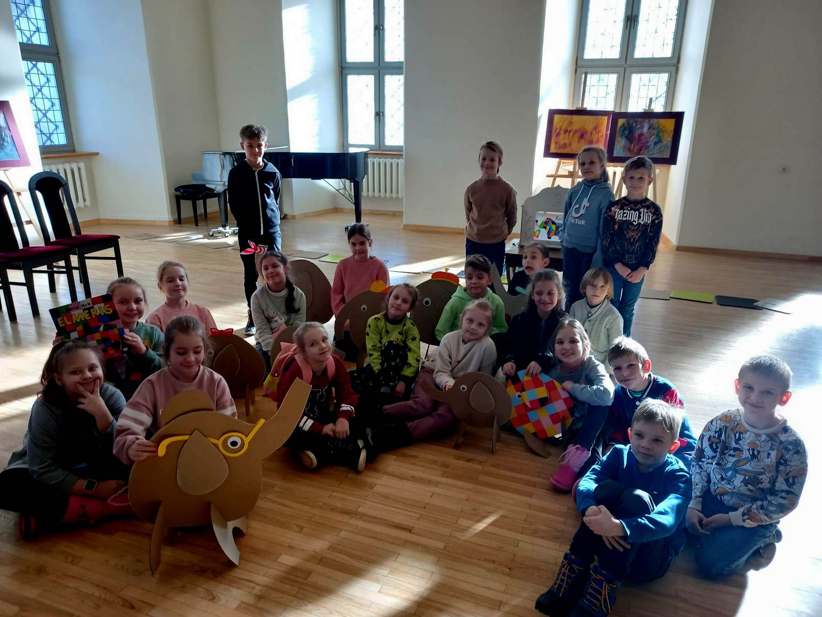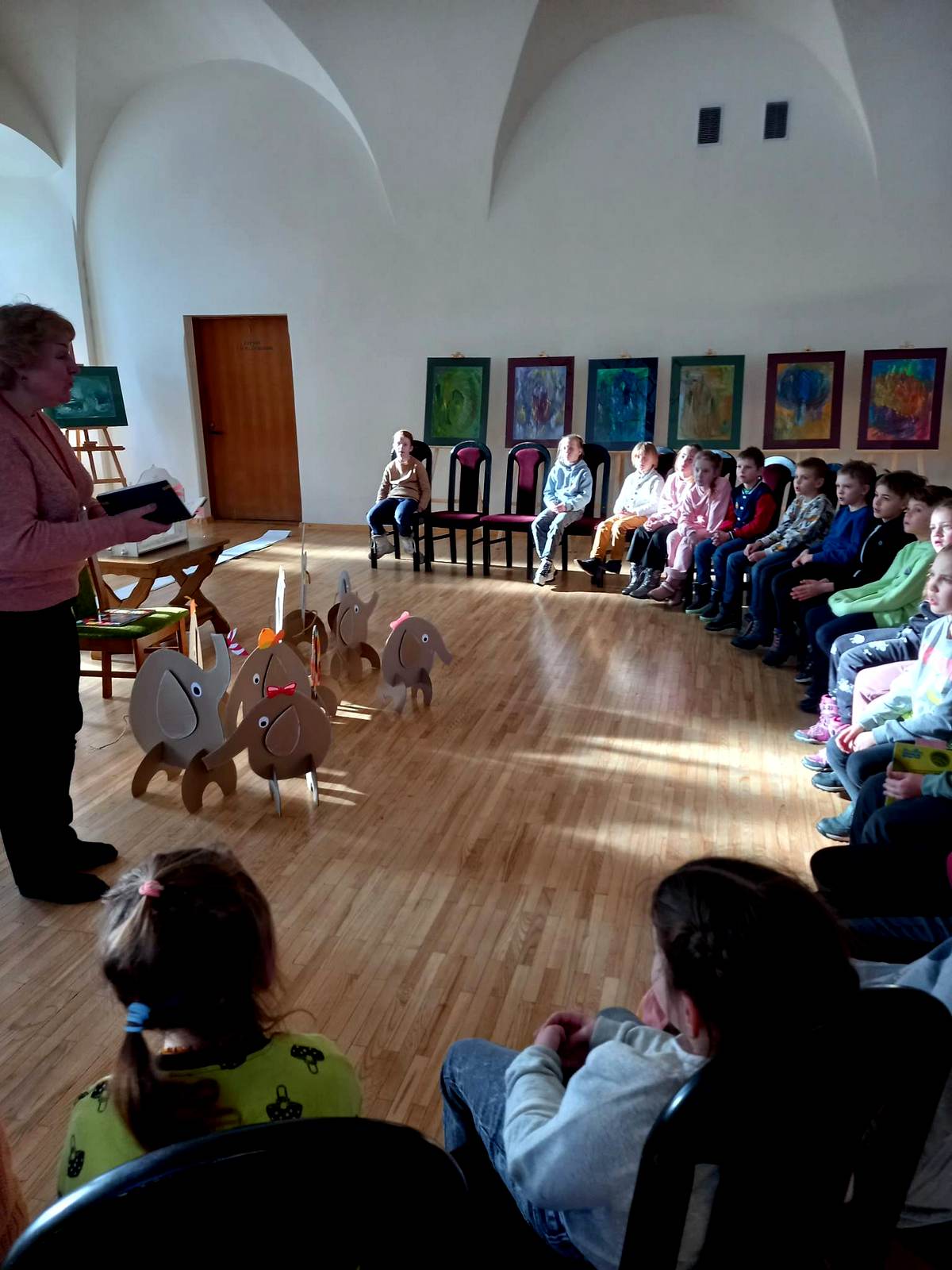 Bibliotekininkė Dalia pristatė knygutę apie išskirtinį drambliuką, kuris buvo kitoks nei visi drambliai. Elmeris –tai spalvotas skiautinukas, kuris buvo labai linksmas ir nuolat linksmino kitus. Taip pat vaikai sužinojo neįprastos dėžės paslaptį, kuri jų dėka pavirto užburiančiu judančių vaizdų filmu apie Elmerį.