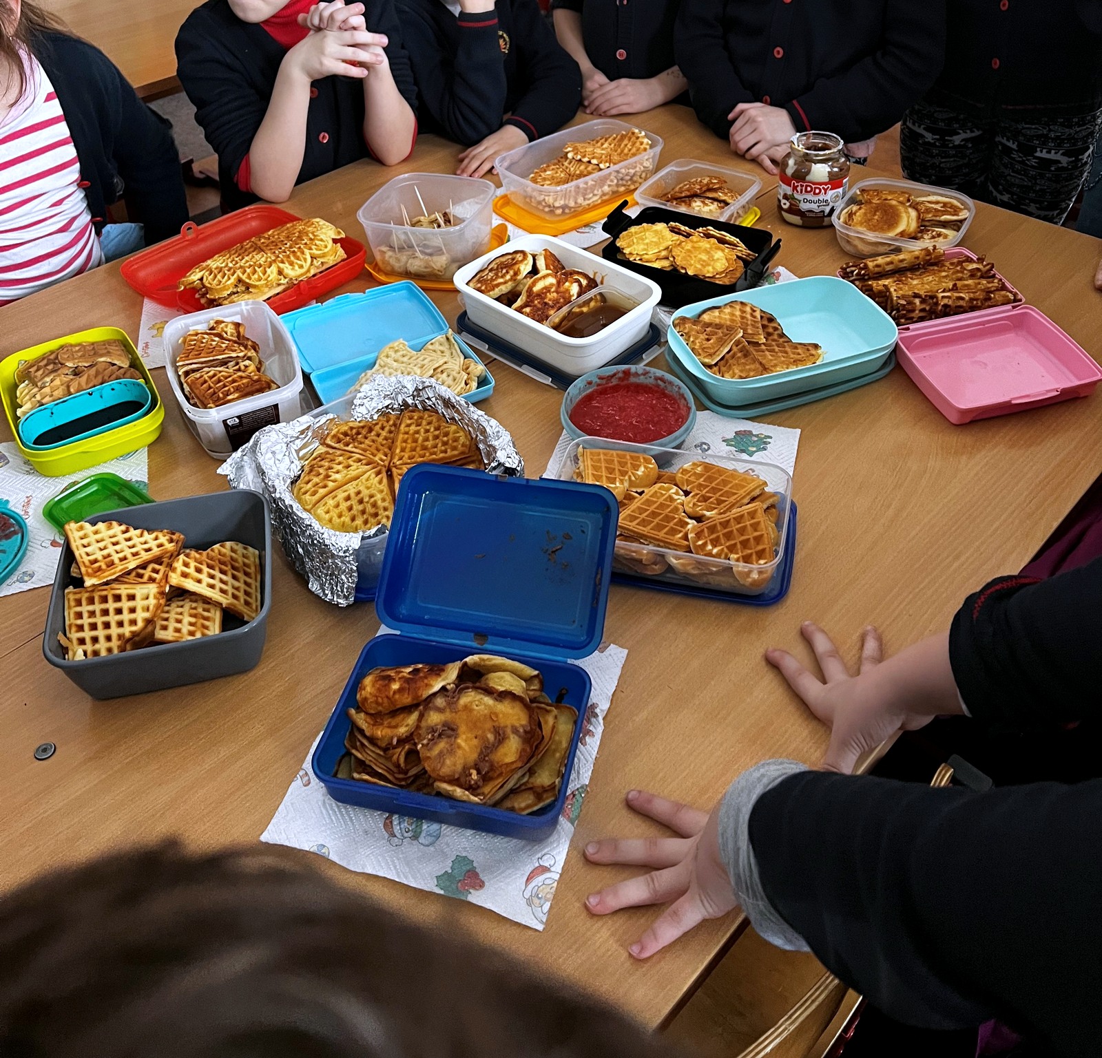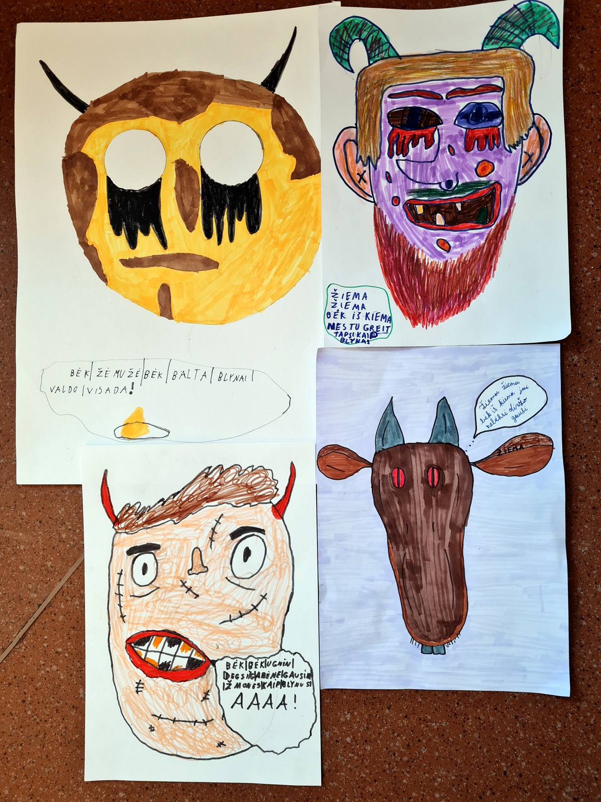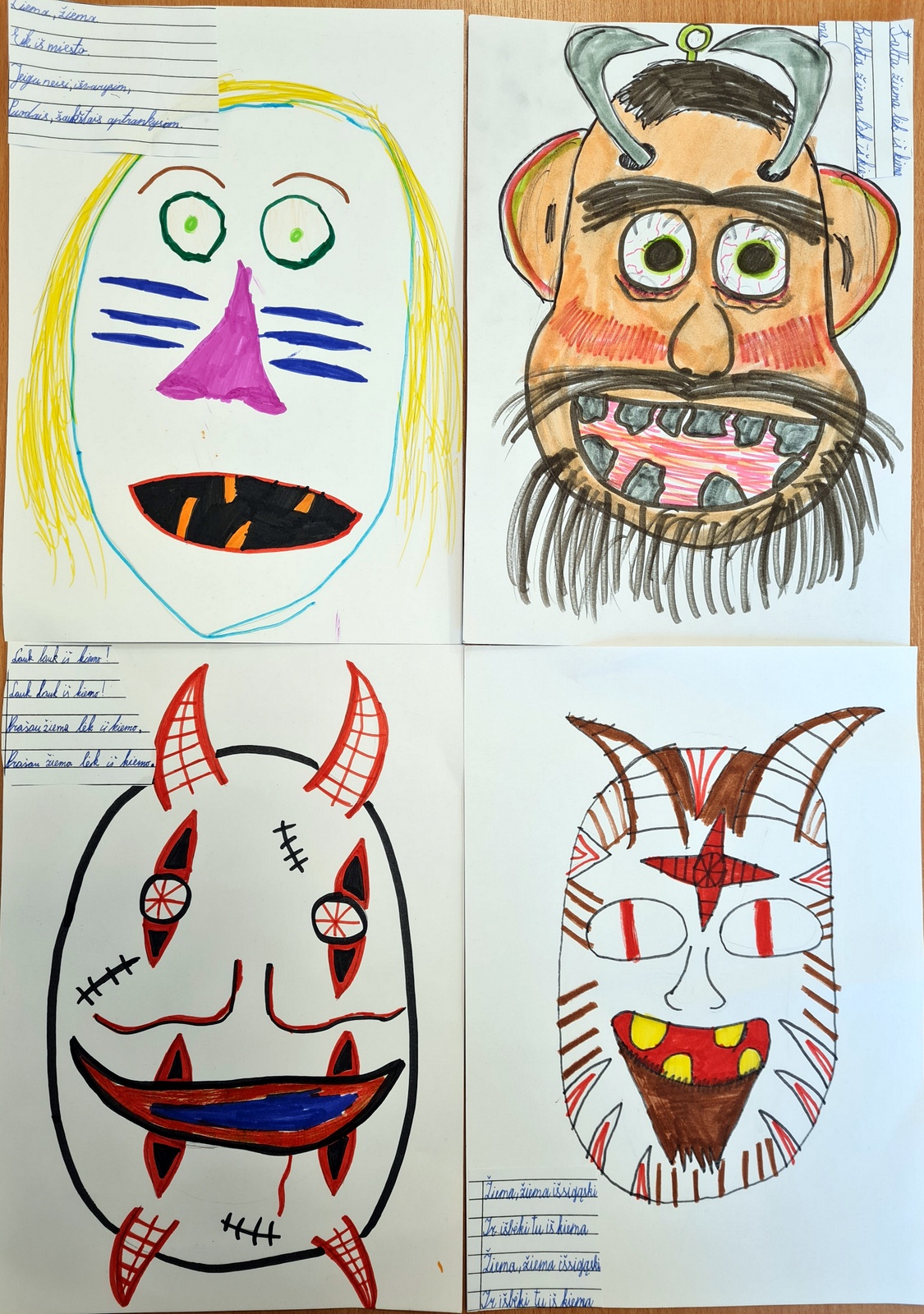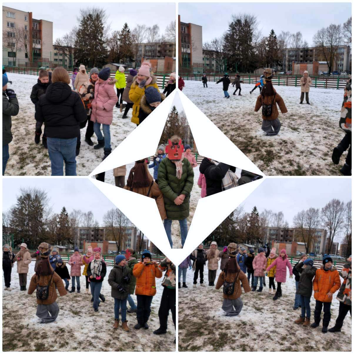 Išsivolioję sniege, grįžo kaukių piešti, tarškynių gaminti ir blynų valgyti. Kokių tik jų nebuvo prisinešę! Tikra blynų puota.