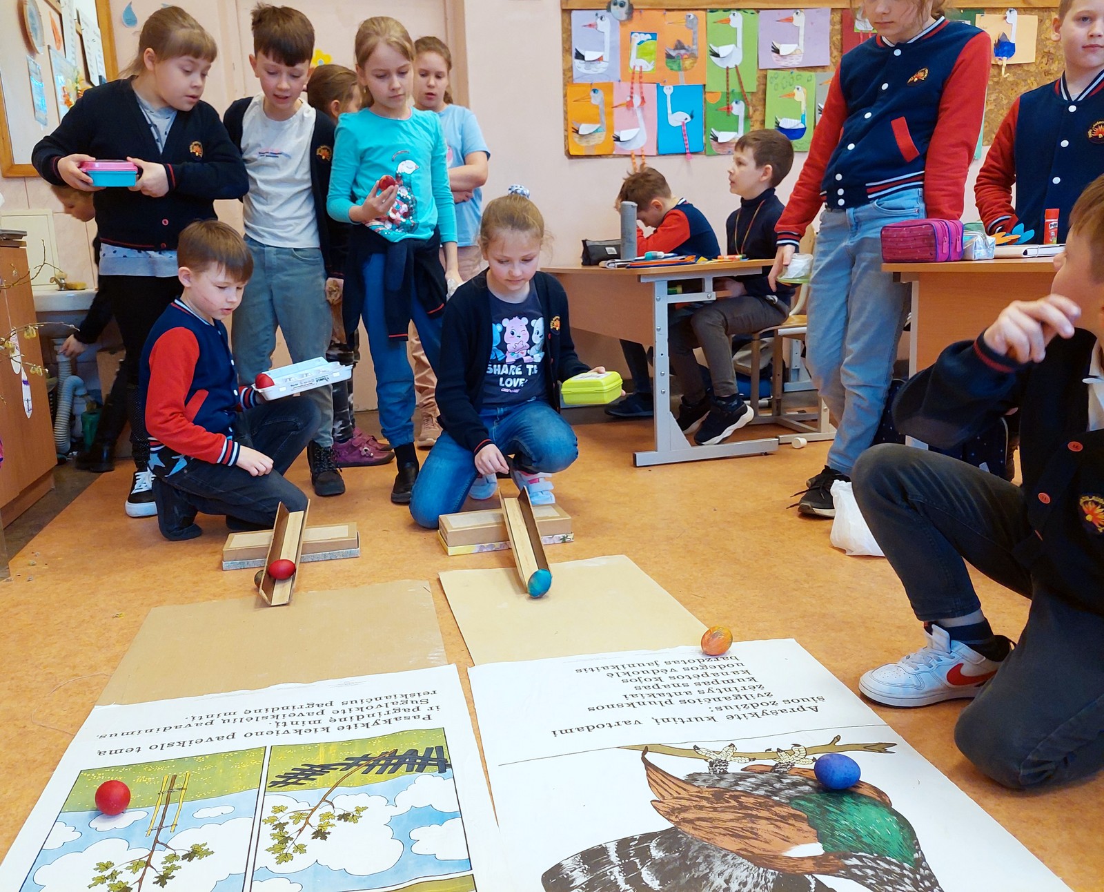 Pradinių klasių mokytojos organizavo integruotas lietuvių kalbos, matematikos, pasaulio pažinimo, muzikos, dailės ir technologijų pamokas, kurių metu prisiminė šv. Velykų ir Atvelykio tradicijas bei papročius, aptarė kiaušinių marginimo būdus ir reikšmes, dainavo daineles, žaidė žaidimą „Kiaušinių ridenimas“, išsirinko klasės Kiaušinių Karalių.