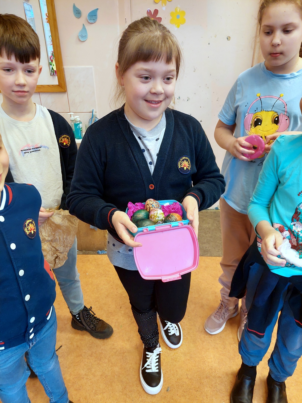 Po to paralelinių klasių mokiniai puošė Didįjį margutį pagal pasirinktus marginimo motyvus. Mokiniai žinias įtvirtino per praktinį patyrimą: gamindami darbelius, naudodami kiaušinių dažymo, dekoravimo būdus.