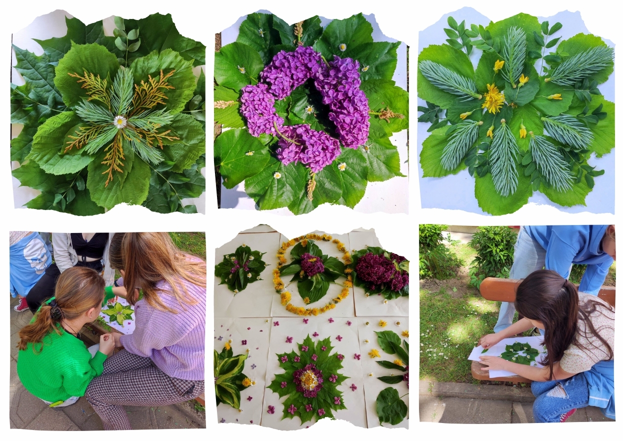 5 klasių mokiniai, susipažinę su frotažo atlikimo technika, mokyklos kiemelyje prisirinkę įvairių lapų, žiedų, o kai kurie išbandę įvairesnes faktūras: plytelių grublėtą paviršių, medinio suoliuko rieves, gamino kūrybinius darbus. 6 klasių mokiniai, dirbdami porose, piešė simetriškus drugelius ir juos spalvino naudodami įvairių spalvų augalus. Nupiešti simetrišką drugelį mokiniams buvo didžiulis iššūkis, tačiau atsirado mokinių, kurie sugalvojo, kad galima pasinaudoti saulės šviesa. 7a,c ir 8a klasės mokiniai dirbdami grupėse iš augalų kūrė mandalas. Kurdami jie turėjo išlaikyti simetriją, ritmiką ir panaudoti mažiausiai 4-5 spalvas ir atspalvius.