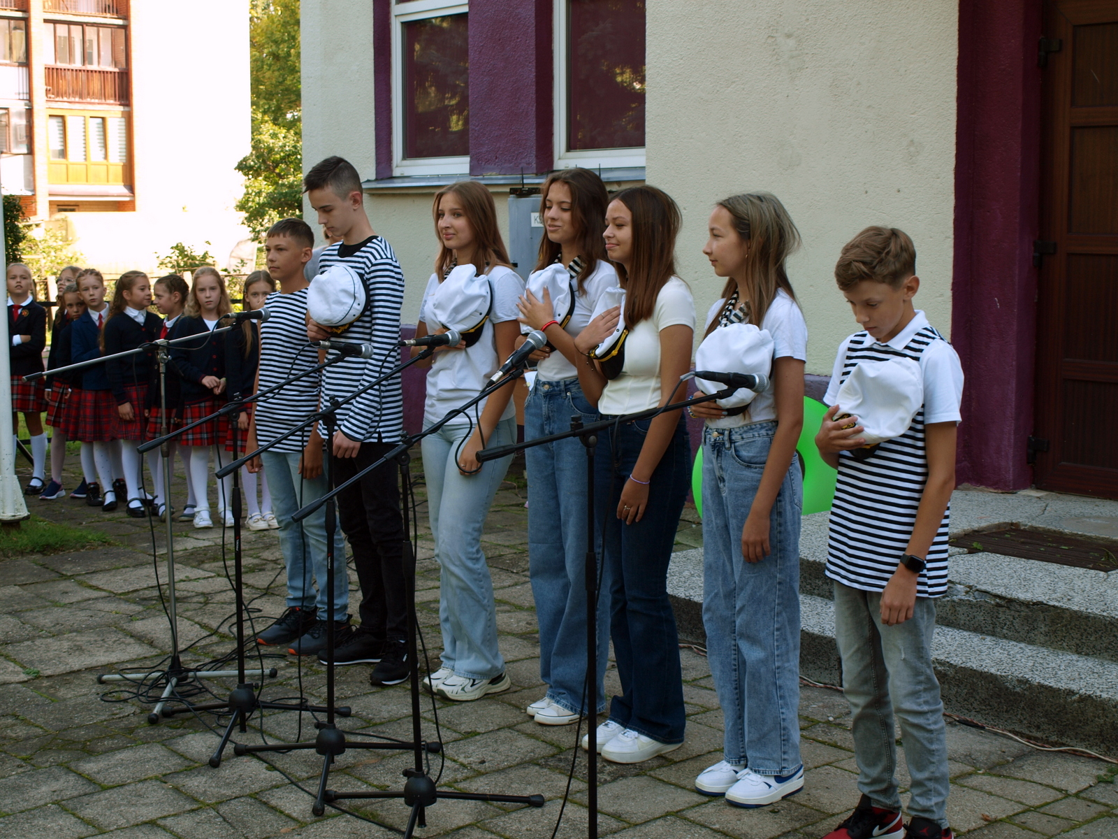 Visus linksmai nuteikė jaunųjų dainininkių, paruoštų mokytojos Jolantos Stasiūnienės, dainelė apie ruduosius meškiukus. Atidžiai išklausę laivo AUŠRA taisyklių pirmokai prižadėjo jų laikytis, būti dėmesingi, drausmingi ir draugiški. Po to kartu su jūreiviais paskandavę „Mylim AUŠRĄ“ buvo priimti į laivą ir patraukė į pirmąją pamoką.