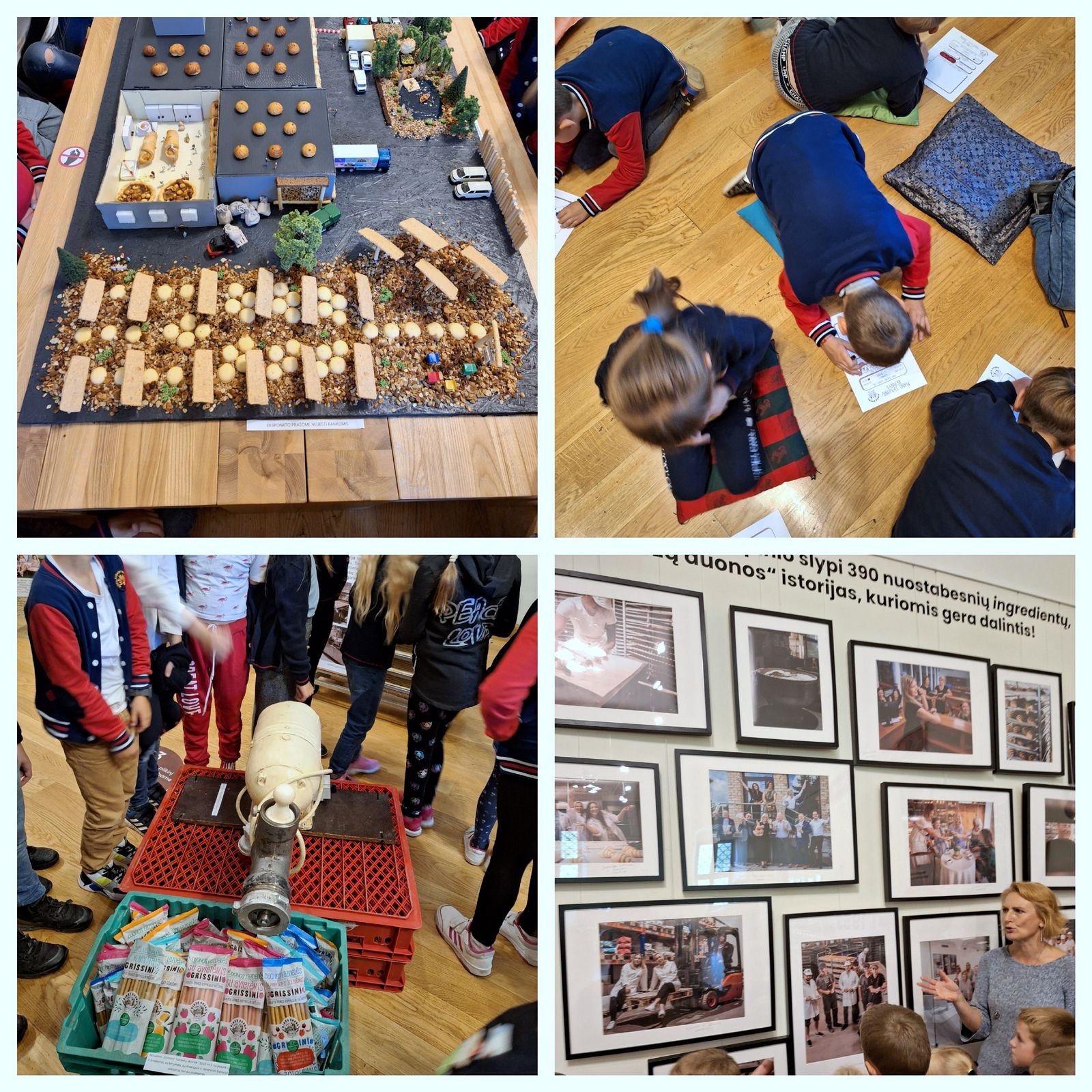 Vaikai išgirdo duonos kepyklos atsiradimo istoriją, pamatė, kiek daug įvairių kepinių kepa kepykla, kurių visų dar ir neteko paragauti. O iš ko jie gaminami? Mokiniai išvydo didžiulį tešlos minkymo kubilą, kuriame krūvelėmis pūpsojo įvairių rūšių miltai. Juos sudomino ir istorinė duonos lazdelių gaminimo mašina, kuri priminė didžiulę mėsmalę. Mokiniai liko sužavėti saldžiuoju ,,Biržų duonos“ maketu, kuris sukurtas iš kepykloje gaminamos produkcijos. Jame pamatė ,,pastatytą“ kepyklą, saulės elektrinę, mašinas, mažus bičių avilius, tvenkinį. Žiūrėdami kepykloje dirbančių žmonių nuotraukas, antrolai bandė atspėti, kokius darbus ir kurių profesijų žmonės dirba. Vaikai gyrėsi, kad ir jų močiutės, mamytės namuose kepa duoną, pyragus.