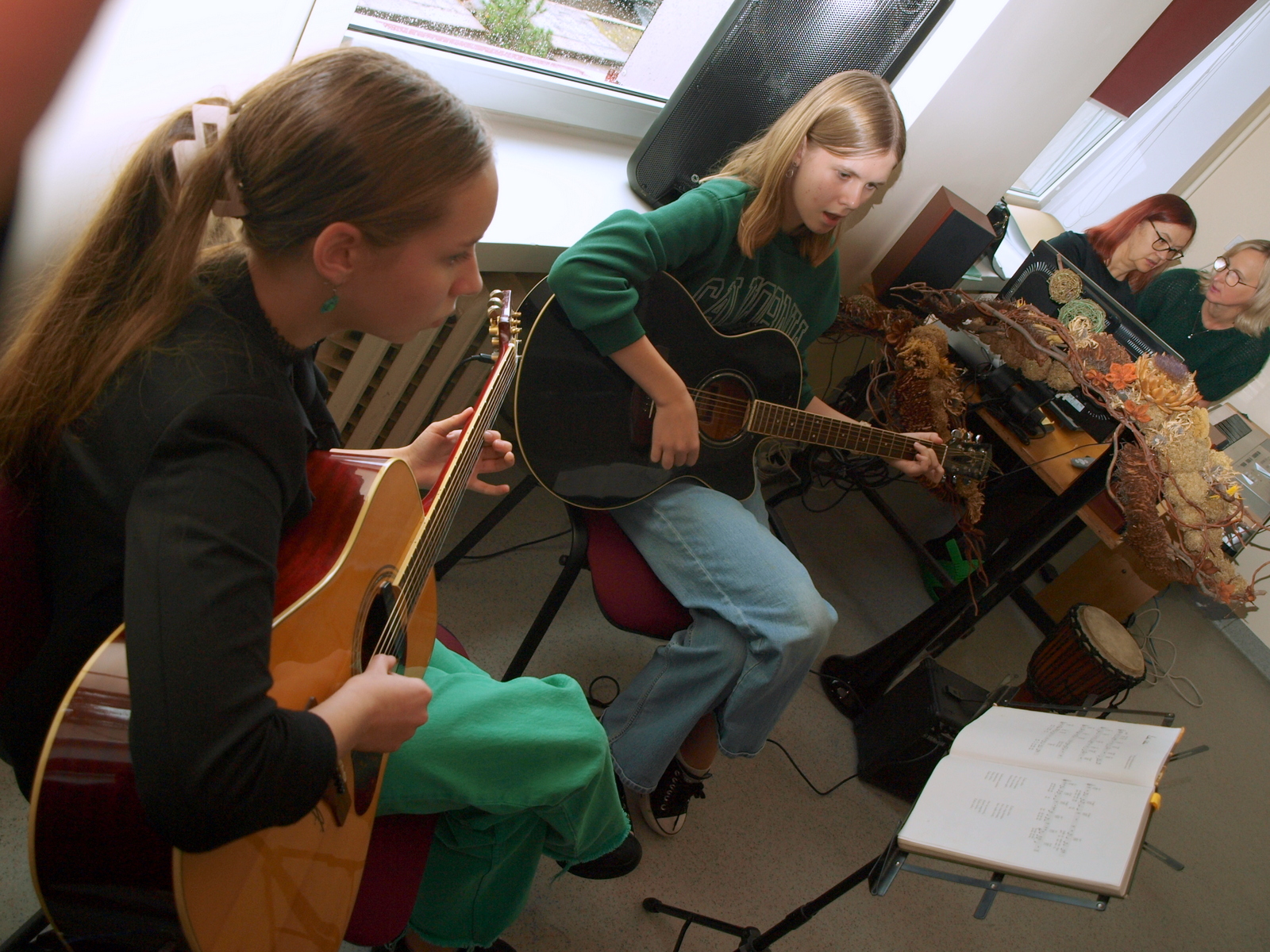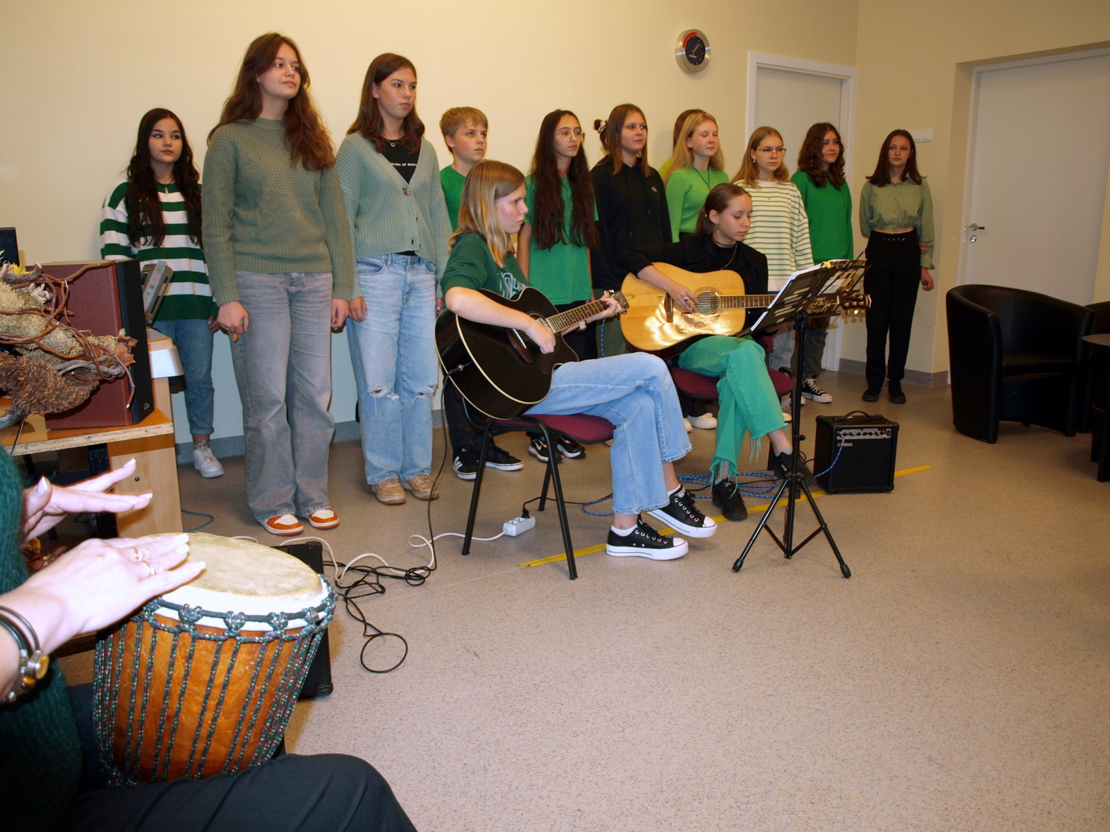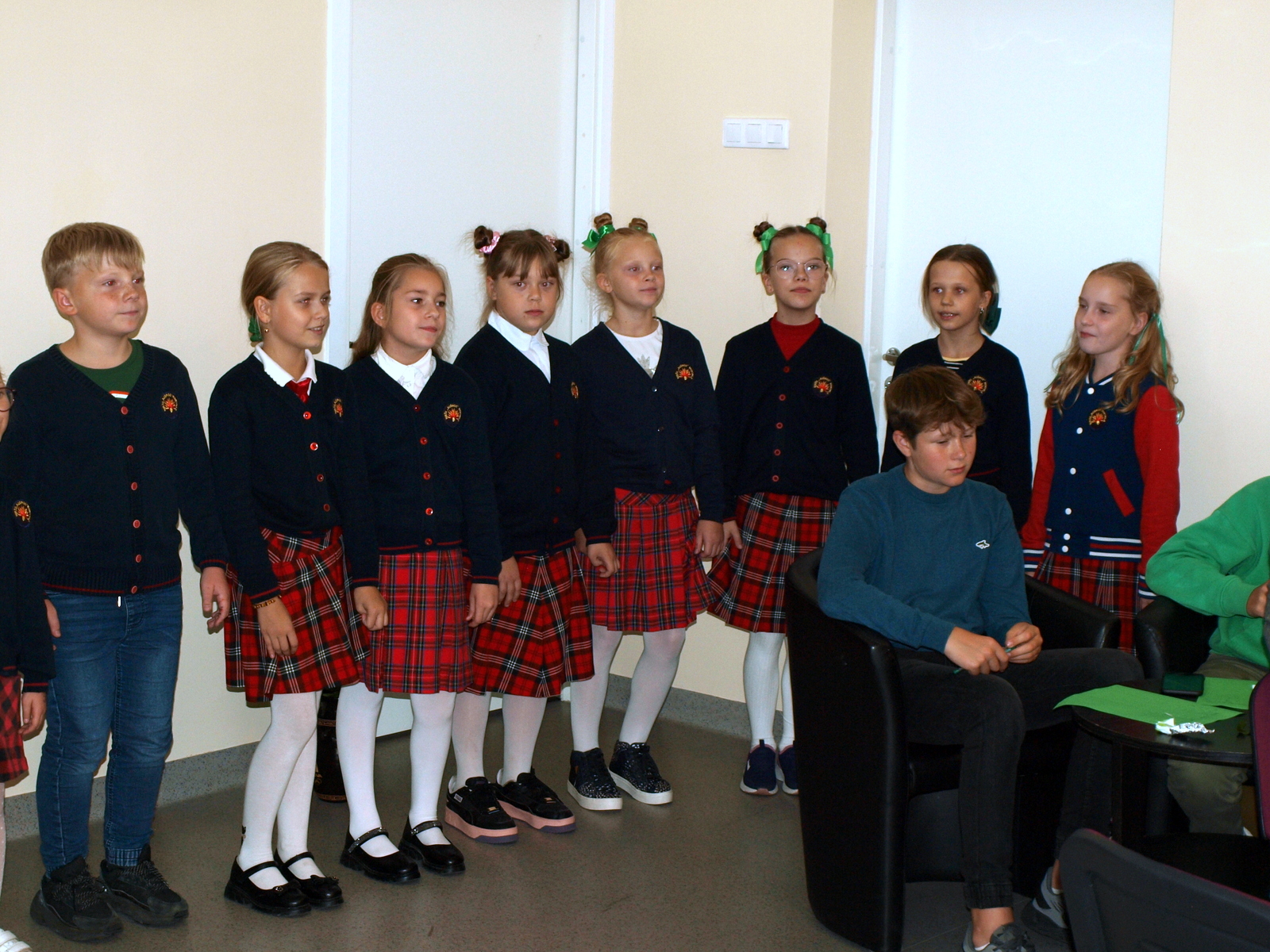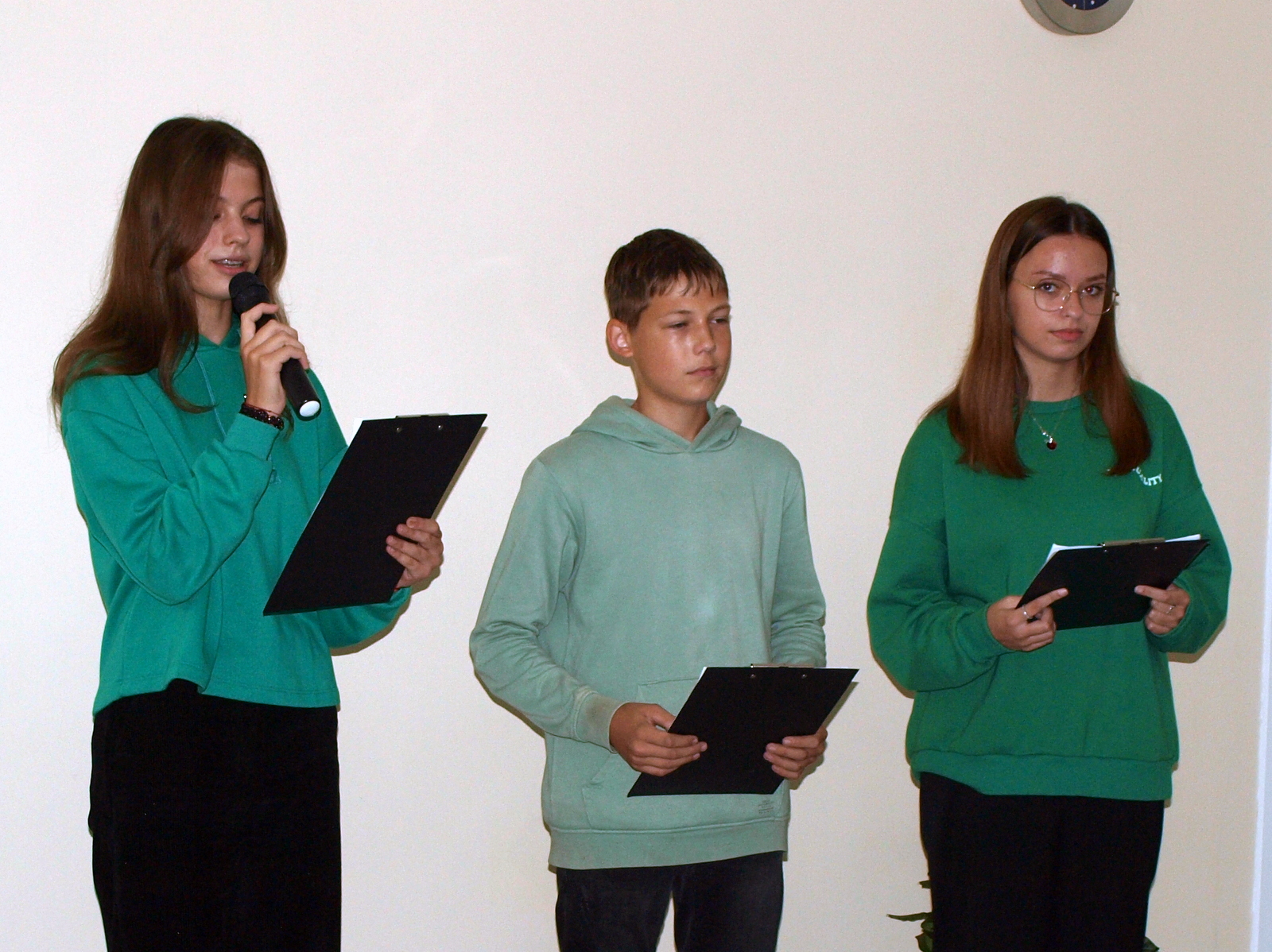 Trumpai, bet linksmai pasveikinę mokytojus aštuntokai ėmėsi mokytojų patikros. Pirmiausia jie pasiūlė prie penkių stalų susėdusioms penkioms komandoms sugalvoti vieno žodžio (sudurtinio, termino ar kokio kito pačių sudėlioto) „žalią“ pavadinimą. O tada… tada „Žaliažiogiai“ „Žaliumai“, „Žaliaskarės“, „Žaliūkai“, „Žolynėliai“ įsijungė į darbą.