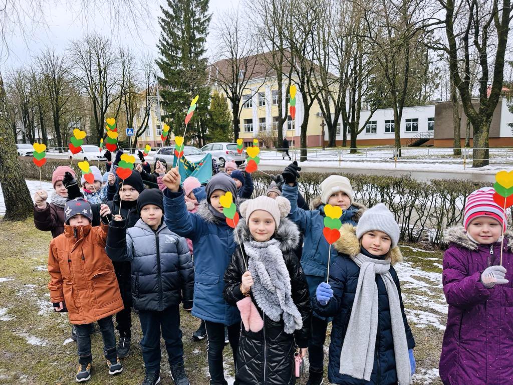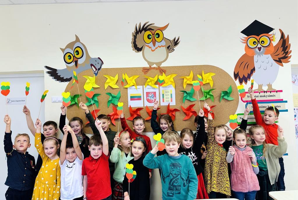 1c klasėje rytas prasidėjo skambant I. Šeduikienės dainai „Nupiešiu Lietuvą“. Padainavus mokiniai pakartojo ir pagilino žinias ne tik apie Vasario 16-osios šventę, bet ir apie mūsų šalį. Vaikai dalyvavo interaktyvioje viktorinoje bei iš spalvoto popieriaus pasigamino trispalvius darbelius – ,,širdeles“. 1b klasės mokiniai dailyraščiu rašė ,,Tautišką giesmę“, kūrė debesėlius. 2-ų klasių mokiniai „keliavo“ po Lietuvą atlikdami užduotis stotelėse. 12 komandų aplankė net 12 stotelių, kuriose atliko interaktyvias užduotis, statė pilis ir dėliojo mozaikas, kūrė plakatą ir rašė sveikinimą Lietuvai, sprendė galvosūkius. 3b klasės mokiniai pynė trispalves kasas, kūrė komiksą tema „Sukurk komiksą apie Lietuvą“, dalyvavo viktorinoje „Viskas apie Lietuvą“. 4c klasės mokiniai, susipažinę su tautiniais raštais, simetriškumu, spalvomis, sukūrė tautinei juostai raštą.