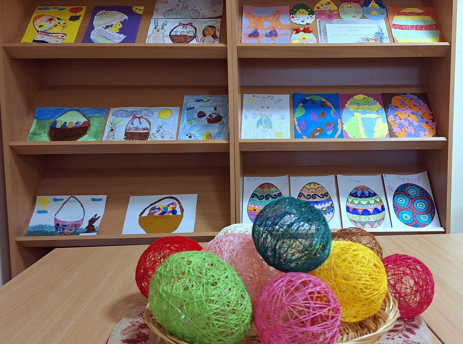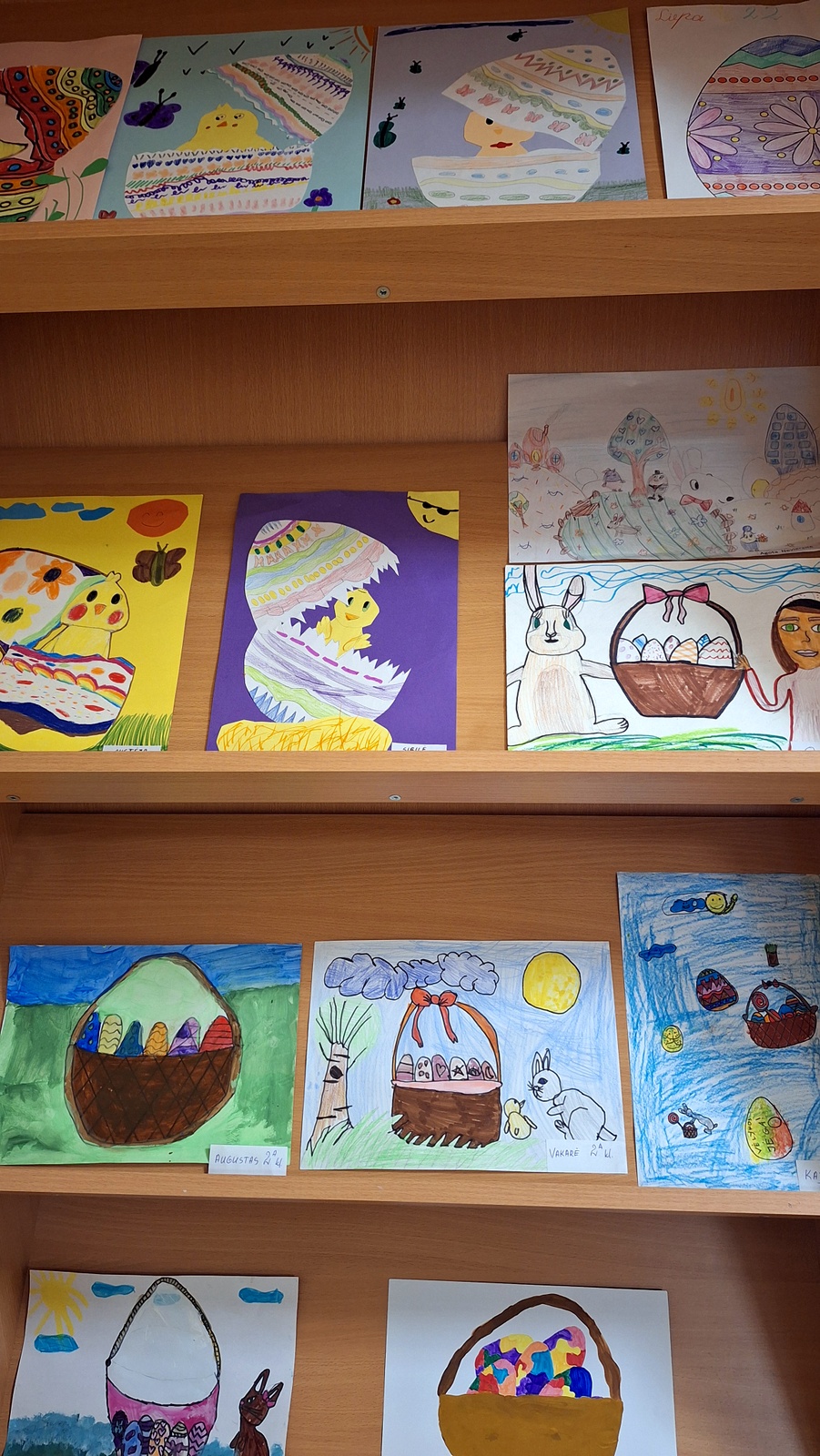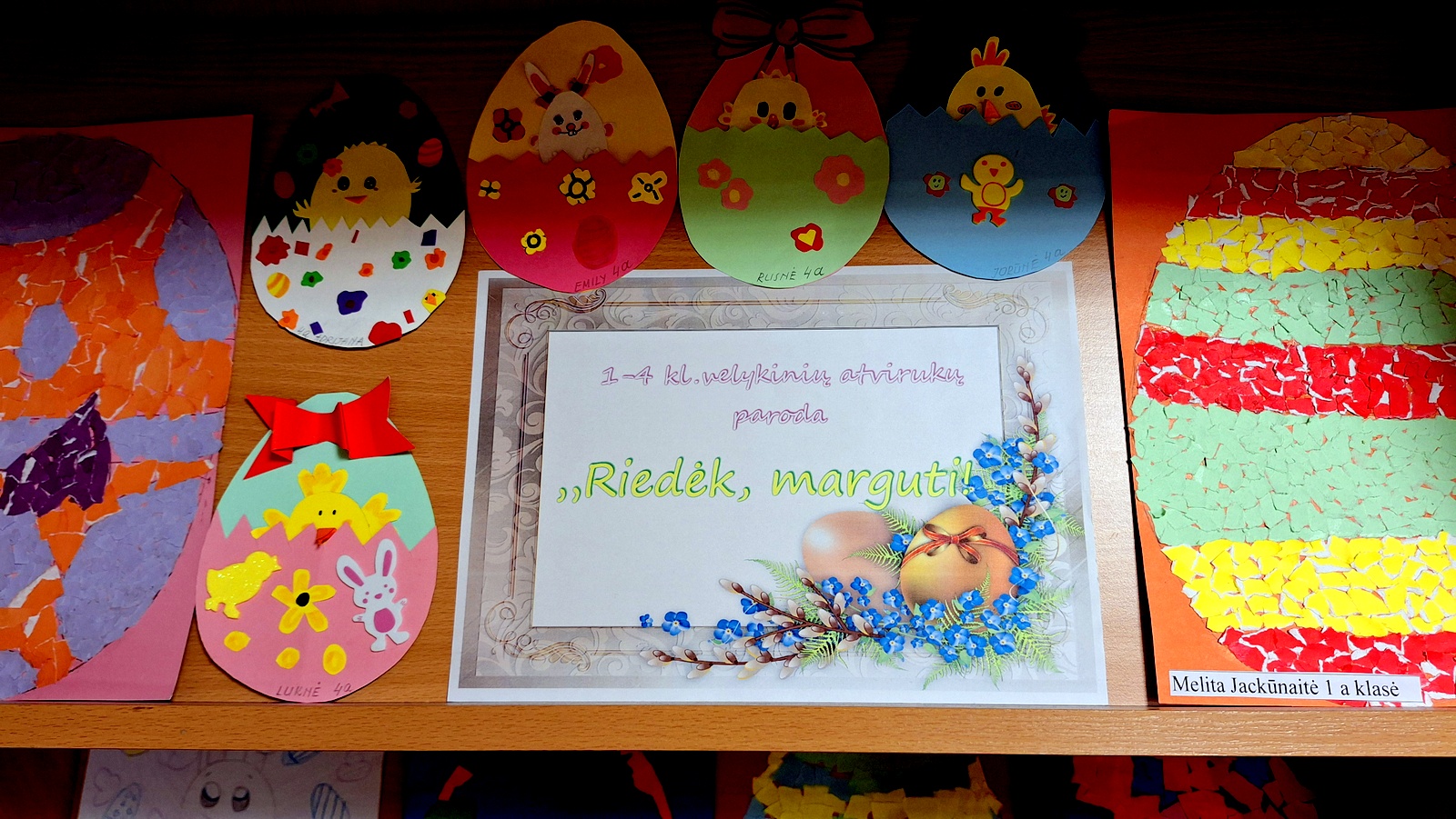 Mokyklos bibliotekoje vyksta 1-4 kl. mokinių piešinių ir darbelių paroda „Riedėk, riedėk, marguti!“.