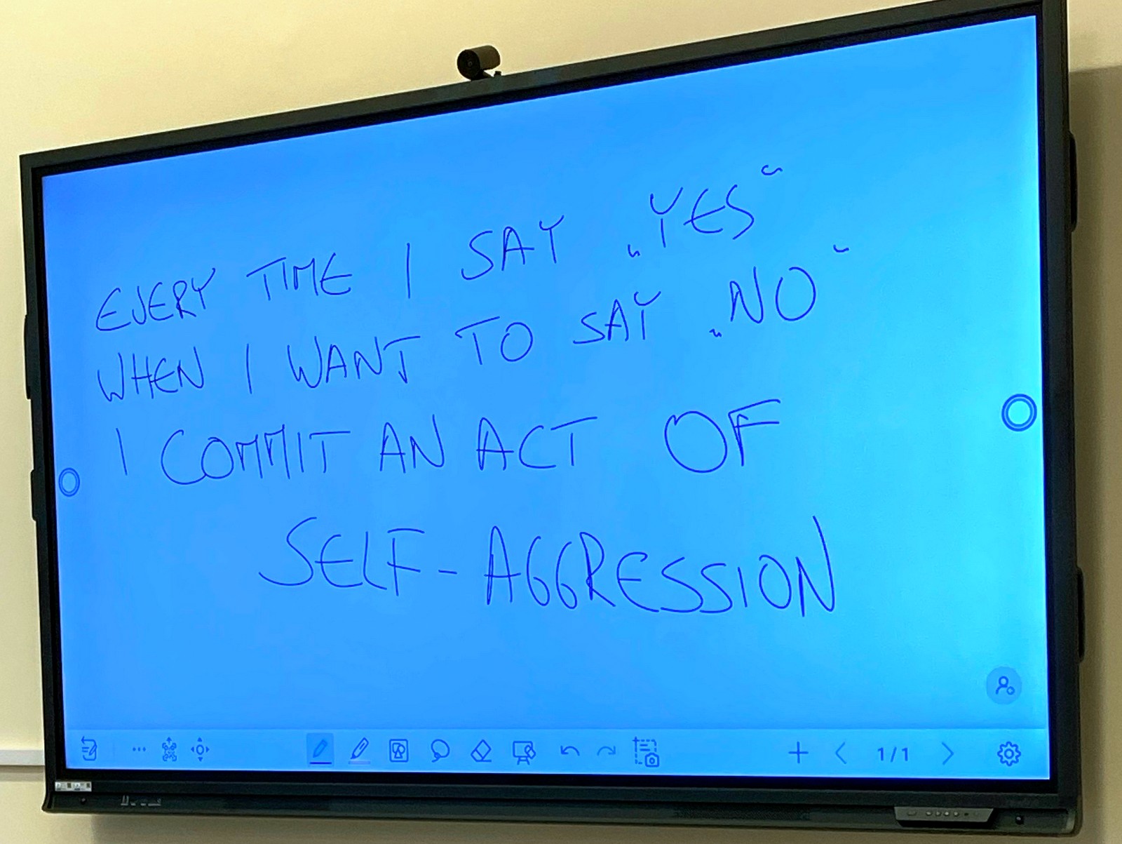Paruoštukų su patarimais, kiek dirbti, kiek ir kaip ilsėtis, psichologas neišdalino, tačiau dar kartą patvirtino mintį, kad tik mes patys geriausiai žinome, ko mūsų gyvenime trūksta ar yra per daug. Ir patys turime po truputį keisti(s). Jei esame pernelyg pamėgę struktūras, galime sąmoningai į savo gyvenimą įnešti šiek tiek chaoso, jei mėgstame kontroliuoti – suteikti daugiau laisvės. Kodėl žmonės perdega arba atsiranda nepilnavertiškumo kompleksas? Psichologas iliustravo piešiniu: nupiešė vieną didelį burbulą – vieną mūsų gyvenimo dieną – pilną įvairių dydžių burbulų, kurie atspindi mūsų dienos darbus, užduotis. Atliekame darbą, burbulas tarsi ,,nusėda“, įgauna vertę, ,,užsitušuoja“, nepilnai ,,užtušuoti“ ar tušti burbulai mums kelia nemalonias emocijas. O kiek ir kokio dydžio darbų-burbulų mes įsileisime į didįjį burbulą, iš dalies priklauso nuo mūsų pačių.