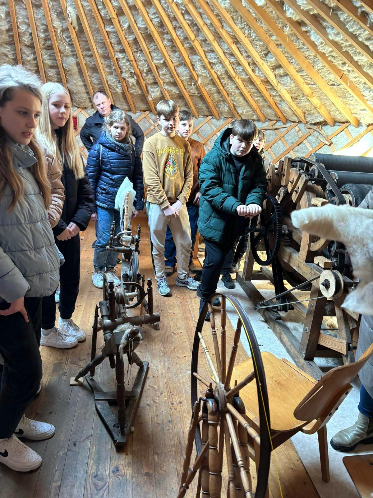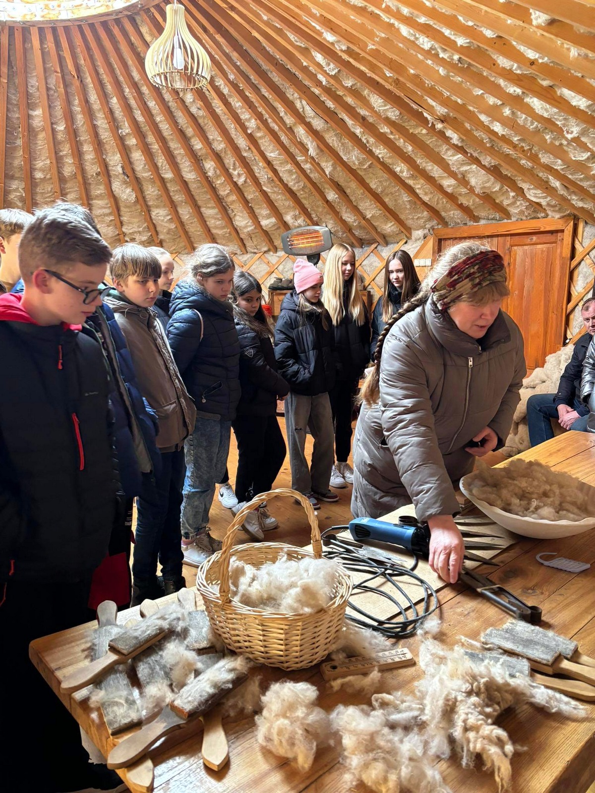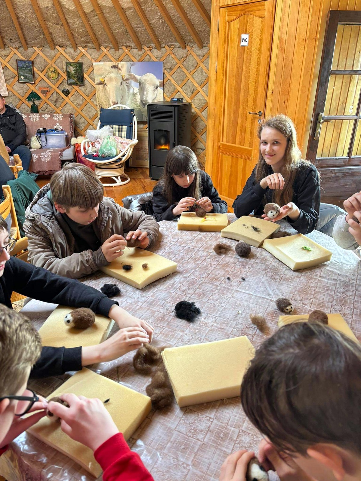 Avių ūkio savininkė K. Milišiūnienė supažindino mokinius su keliomis auginamomis avių rūšimis, praktiškai demonstravo visus avies vilnos paruošimo etapus, aptarė vilnos savybes ir panaudojimą kuriant rūbus, aksesuarus ar suvenyrus. Visi turėjome galimybę patys išbandyti vilnos pluošto šukavimo ir verpimo procesus. Mokiniai savo kūrybiškumą atskleidė sausuoju vėlimo būdu veldami suvenyrus: ežiukus ar boružėles. Edukaciją užbaigėme degustuodami užkandėles su aviena ir mėgaudamiesi žolelių arbata.