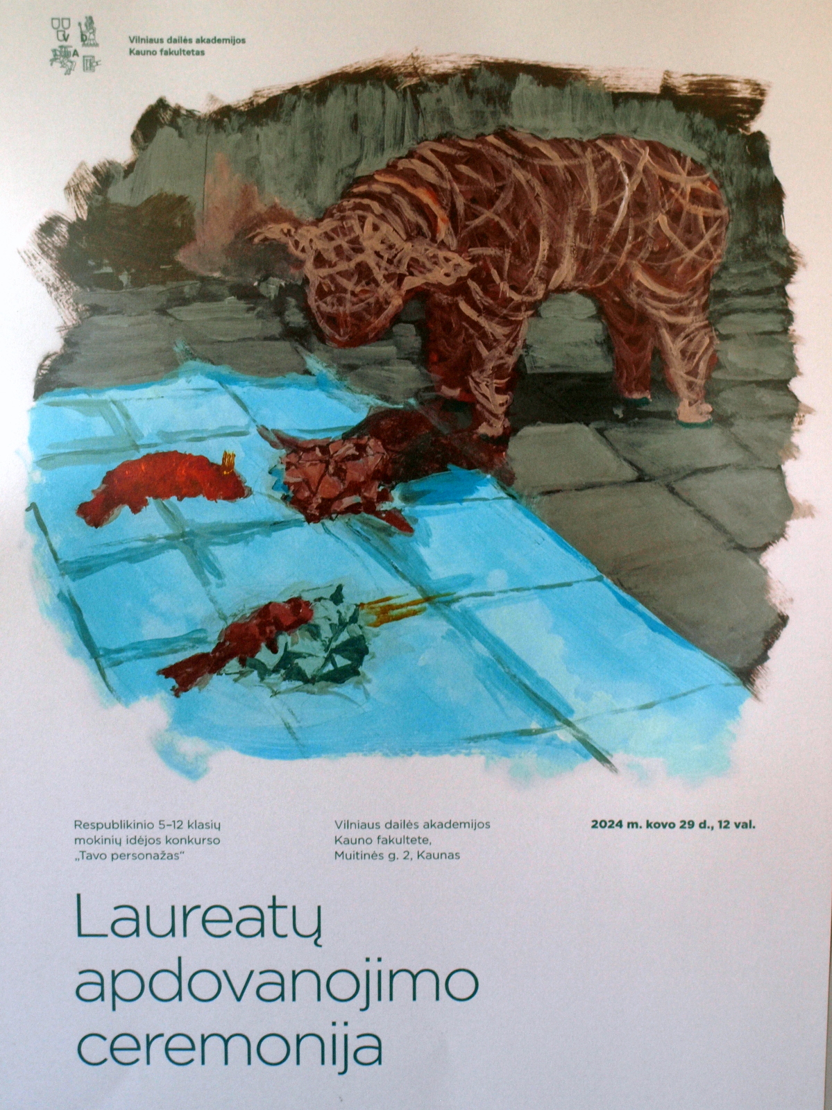 Konkursą „Tavo personažas“, kuris ne tik leidžia atsiskleisti jauniems talentams, bet ir skatina mokinių bei mokytojų bendradarbiavimą, jau septintus metus rengia VDA Kauno fakultetas. Konkursas susideda iš trijų gana sudėtingų etapų: mokytojų dalyvavimo seminare ir mokinių paruošimo, griežtą laiką ir limitą turinčios dalyvių registracijos bei paties konkurso – darbų nurodyta tema atlikimo, trunkančio tris valandas. Dailės mokytojai Rimai Zemlickienei pavyko užregistruoti dvi mokines, kurių talentu ji neabejojo, ir kovo 22 dieną su šeštoke Karolina Balčiūnaite ir aštuntoke Džesika Ambraziūnaite ji vyko į Kauną dalyvauti konkurse.